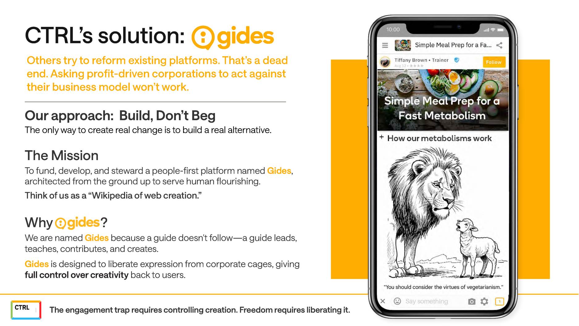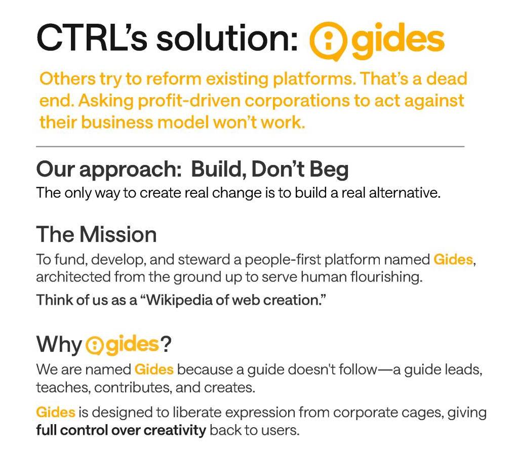 The CTRL Foundation is building a truly viable alternative to a future where expression is permanently shaped by profit algorithms. We must establish a human-centered social platform before the gates close entirely. Your voice, your creativity, your efforts, your vision can help shape a future where expression isn’t owned by profit, but by people.